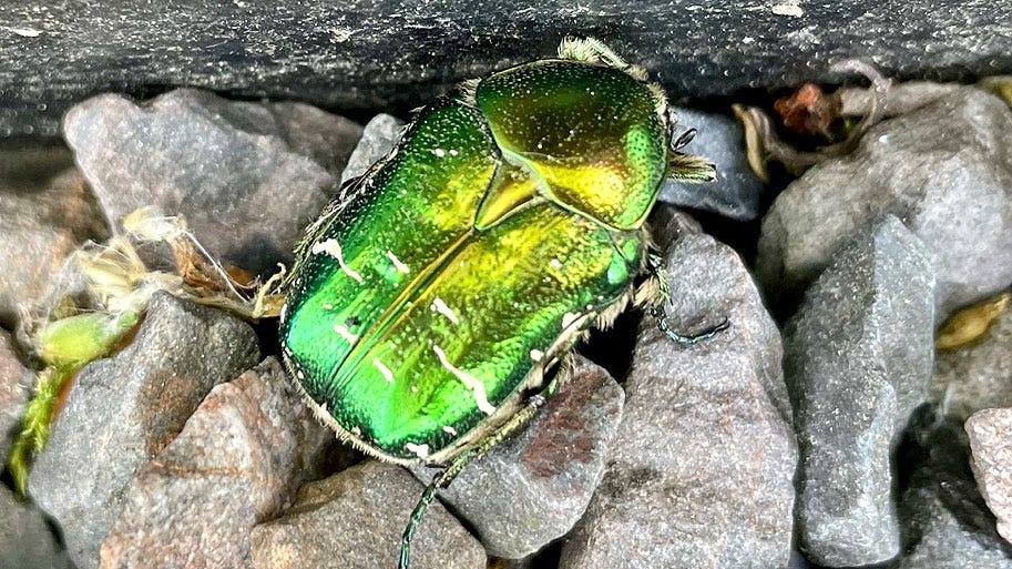 Last summer, a metallic green Rose Chafer beetle landed on my notebook. Its iridescent shell gleamed in the fading sunlight.